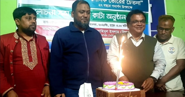 At the end of the discussion, a cake was cut to celebrate the 27th founding anniversary of the national daily Bhorer Chetna.