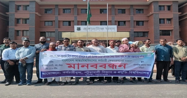 A human chain was organized in front of the administrative building of Patuakhali Science and Technology University (PSTU) at the call of the Bangladesh Inter-University Employees Federation, demanding the implementation of the Ninth Pay Scale.