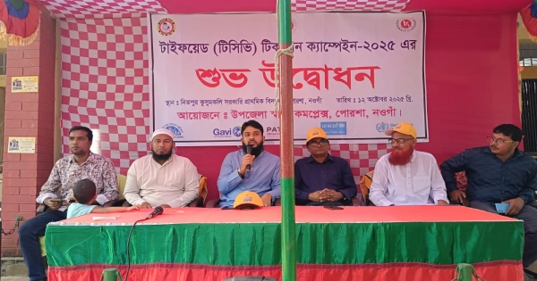 Along with the rest of the country, a free Typhoid Conjugate Vaccine (TCV) campaign has been launched in Porsha upazila of NaogaonTyphoid Conjugate Vaccine (TCV), organized by the Upazila Health Complex. The campaign was inaugurated on Sunday morning at the Kusumkoli Government Primary School in Nitpur by Upazila Nirbahi Officer (UNO) Rakibul Islam, who attended as chief guest. Among others present were Upazila Health and Family Planning Officer Dr. Nazir Ahmed, Head Teacher Shahjahan Ali, Assistant Teacher Hafizur Rahman, several health assistants, and local dignitaries. EPI Medical Technologist (MT-EPI) Shahabul Alam said the vaccination drive, under the Expanded Programme on Immunization (EPI), will continue from October 12 for the next 18 days. During this period, 23,850 children from educational institutions and 16,743 children outside schools in the upazila will receive the typhoid vaccine.
