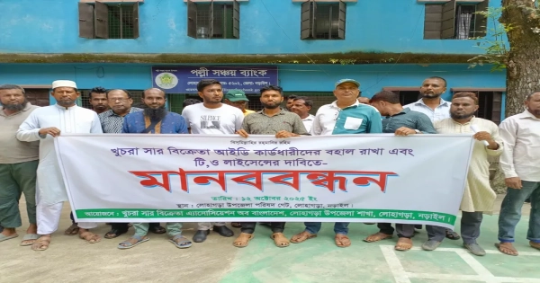 Retail fertilizer traders in Lohagara upazila of Narail formed a human chain and submitted a memorandum on Sunday (October 12), demanding the cancellation of the government’s decision to suspend their business licenses and calling for measures to protect their livelihood.