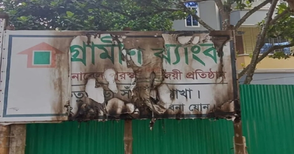 Sumi Khatun, the branch manager of Miyapur Grameen Bank at Khetupara, reported that vandals had set fire to the bank's signboard during the night. The signboard has been destroyed. There is growing concern among the residents of Ela.