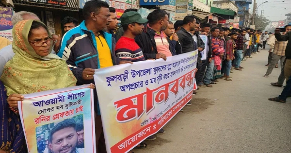 The human chain was held at the local Nimtala intersection on Thursday afternoon. In the human chain, Shibli Sadiq said that he and his elder brother Sohel Ahmed bought a land next to the Eidgah ground adjacent to the Phulbari BGB camp. He was harassed while filling the land with soil.