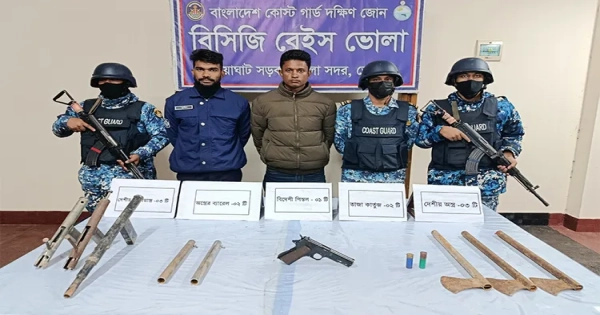 In a joint operation in Bhola, the Coast Guard and police have arrested 1 person named Md. Russell (37) along with 1 foreign pistol, 3 domestic firearms, 2 domestic firearm barrels, 2 rounds of cartridges and 3 domestic weapons.