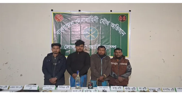 The arrested are Tofail Mandal (25), son of Md. Kamruzzaman Mandal of Dighalia village in Lohagara upazila, Md. Russell Biswas (19), son of Tabibur Biswas of Lahuria Daharpara village in the same upazila, Ismail Hossain alias Pintu (50), son of the late Nur Islam Gazi of Boishkhali village in Shyamnagar, Satkhira, and Aminur Gazi (45), son of the late Tofazzal Gazi of the same village.