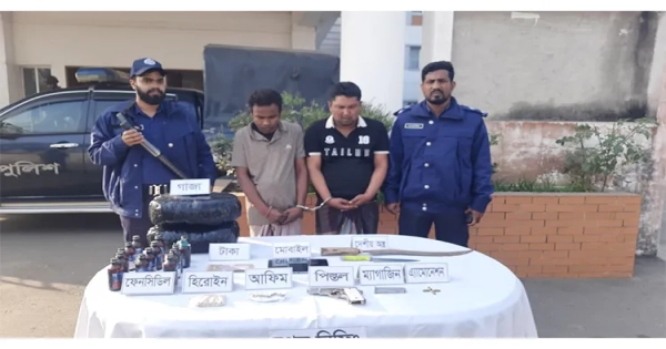 At that time, a 7.65 mm. TT-33 illegal pistol, one magazine, four rounds of bullets, five kg of marijuana, 50 grams of heroin, 50 grams of opium, 14 pieces of phensedyl, eight mobile phones, two domestic sharp weapons and 14 thousand taka in cash for drug sales were recovered.