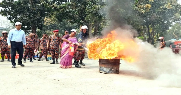 After the rally, members of Bangladesh Fire Service and Civil Defence conducted a practical demonstration on fire safety and emergency response in front of the Deputy Commissioner’s office. The drill showed how to respond during a fire and demonstrated different firefighting techniques.