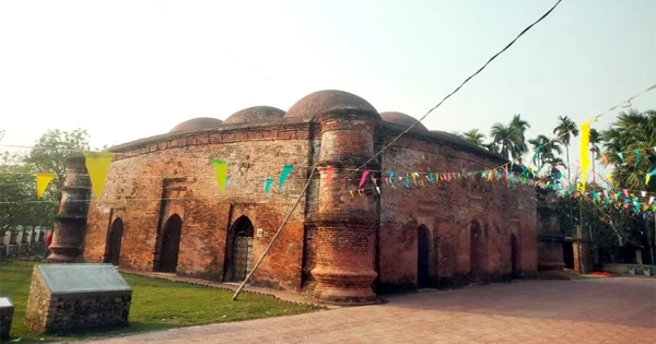 The mosque features nine domes, supported by four brick pillars. Built with lime-surki and thin square bricks, the mosque measures 16.76 meters on each side, with an interior length of 12.19 meters. The pillars divide the interior into nine equal squares, each crowned with a dome. A semicircular mihrab faces the Qibla, while a large entrance and unique architectural style draw visitors.