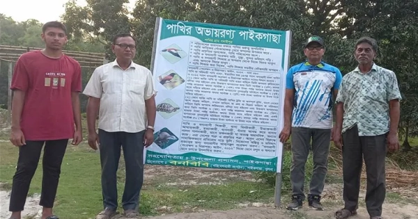 The environmental organization ‘Ban Bibi,’ in collaboration with the upazila administration, has installed a promotional billboard titled ‘Bird Sanctuary Paikgachha’ to combat illegal bird hunting and promote wildlife conservation.