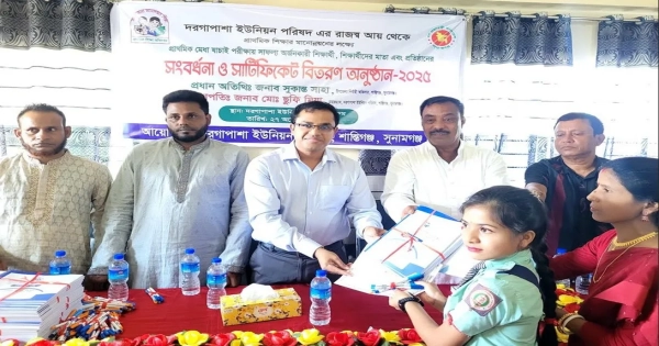 With the aim of improving the quality of primary education from the revenue of Dargapasha Union Parishad of Shantiganj Upazila of Sunamganj district, the reception and certificate distribution 2025 was held in the category of students who achieved success in the Primary Merit Verification Examination, students' mothers and best schools.