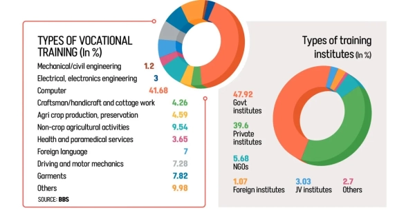Nearly half of all vocational training is provided by government institutes, while private institutes account for 39.6 percent. NGOs contribute 5.7 percent, focusing on women, rural youth and marginalised groups. Foreign institutes and joint ventures provide specialised or advanced skills. The remaining 2.7 percent comes from other centres.