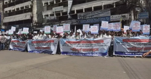 Thousands of former employees from six Islamic banks formed a human chain in the capital’s Dilkusha area on Sunday morning, demanding their jobs back following recent mass terminations.