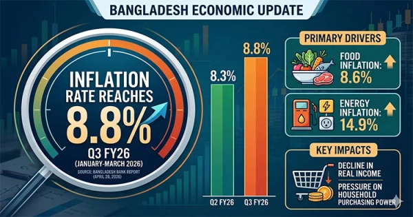 Bangladesh's average inflation rose to 8.8% year-on-year in the January-March quarter (Q3) of FY26, according to the latest quarterly report from Bangladesh Bank released today. This is an increase from the 8.3% recorded in the previous quarter.
