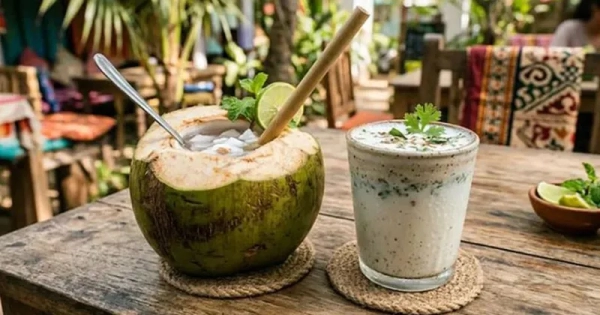 If you are at home, homemade lacchi or ghol made with fresh yogurt is a healthy option, especially for digestion. When outside, coconut water is a safe and refreshing choice. Fresh, green coconut water is best.