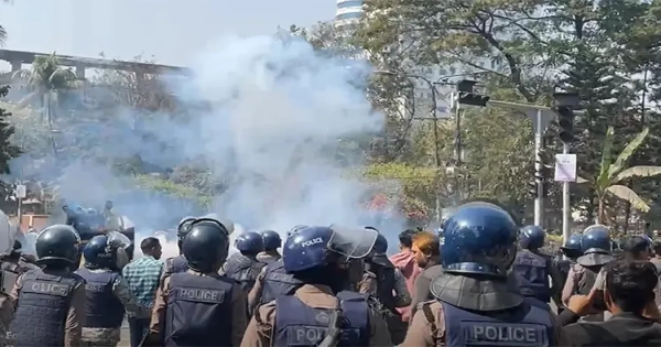 The demonstration began Friday morning at the Central Shaheed Minar. By 11:30 am, protesters marched toward Mintu Road, breaching three police cordons at Shahbagh, the InterContinental intersection, and the entrance to Jamuna.