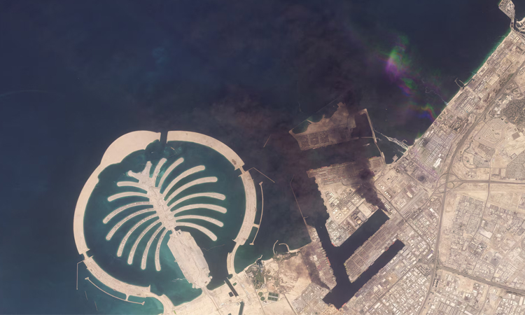 A satellite image of Jebel Ali Port, after one of the berths caught fire because of debris from an intercepted missile, in Dubai, United Arab Emirates.