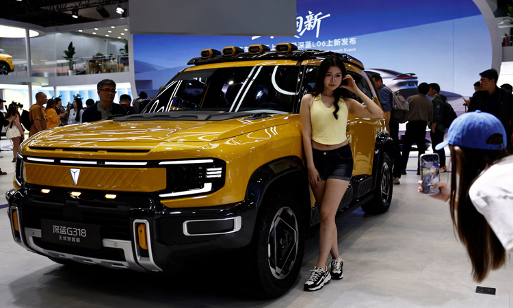 A woman poses with a Deepal G318 SUV.