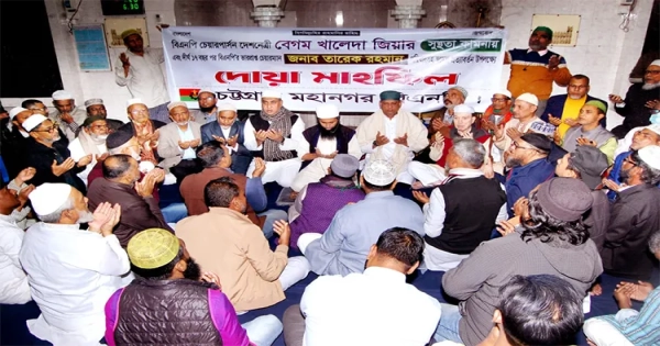 As part of a nationwide central program, the Chattogram Metropolitan BNP organized a special prayer and doa mahfil on Saturday, December 27. The event was held to seek the speedy recovery of BNP Chairperson Begum Khaleda Zia and the safe return of Acting Chairman Tarique Rahman and his family to Bangladesh after 17 years.